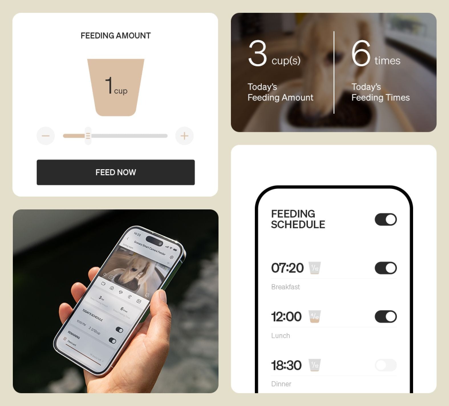 1 portion is 1/12 cup. The feeder can dispense up to 50 servings (4 cups) a meal, and up to 6 meals each day, which makes it a total of 24 cups.
