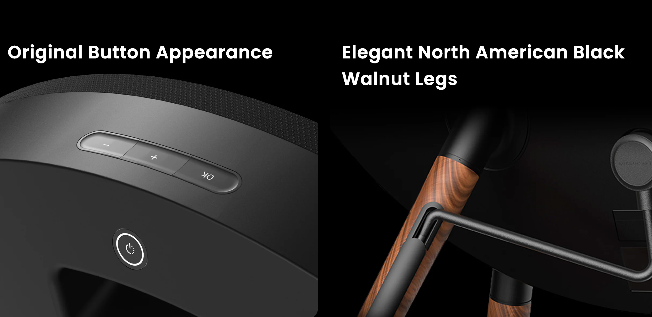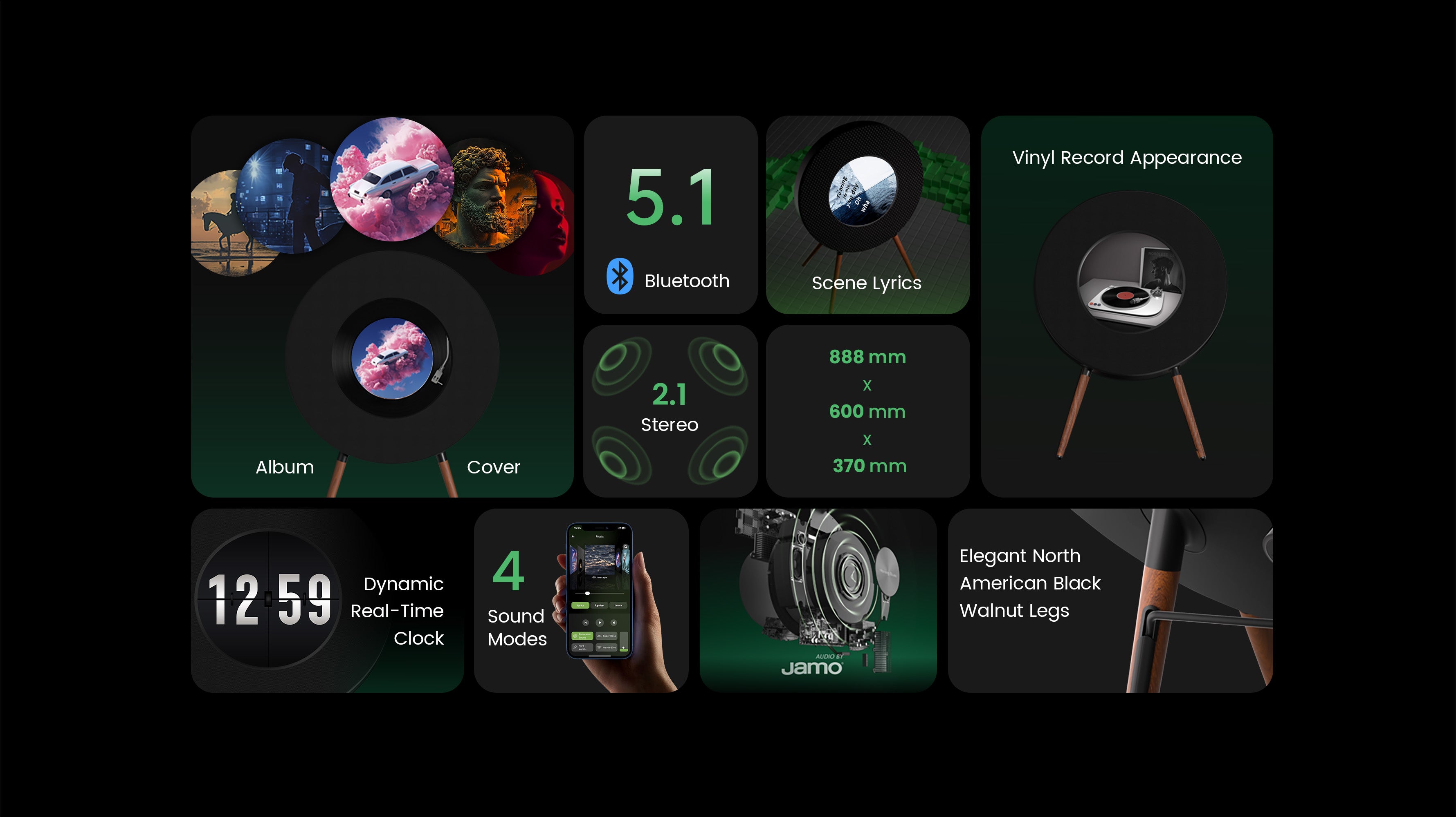 Encased in a minimalist frame with walnut wood legs and textured acoustic fabric, it doubles as a stunning decor piece that complements any interior. Thoughtful design meets intuitive function, with app-based control, smart music syncing, and plug-and-play simplicity.